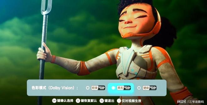 在播放杜比视界内容时,系统提供明亮、柔和、艳丽三种预设,其中“柔和”模式色彩最为准确,用户还可根据幕布尺寸与增益微调映射亮度。