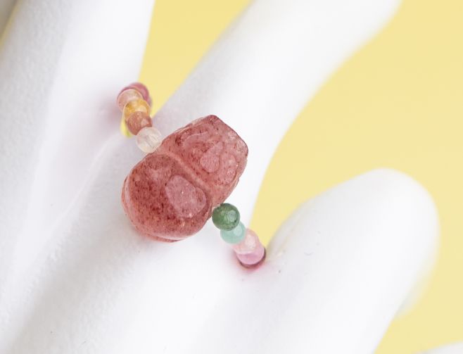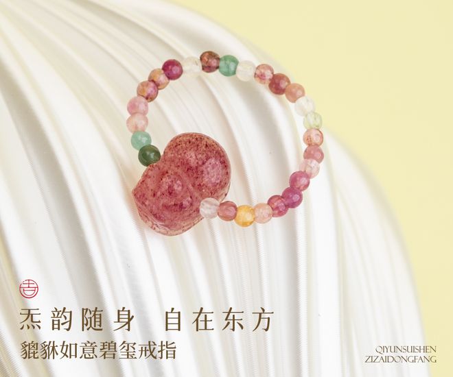 戒圈由碧玺圆珠串成。碧玺因色彩丰富,被誉为“落入人间的彩虹”,而且“碧玺”谐音“辟邪”。