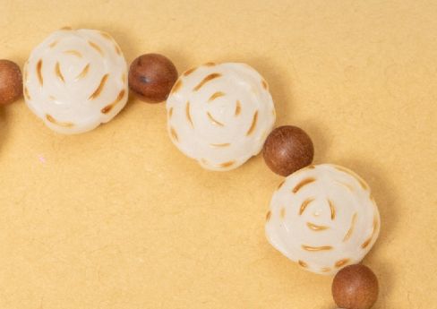 搭配老山檀圆珠作为隔珠。老山檀主要产自印度,是檀香木中的上品,木质细腻油润,散发着独特持久的天然香气,前调是木质清香,中尾调是回甘的奶香。